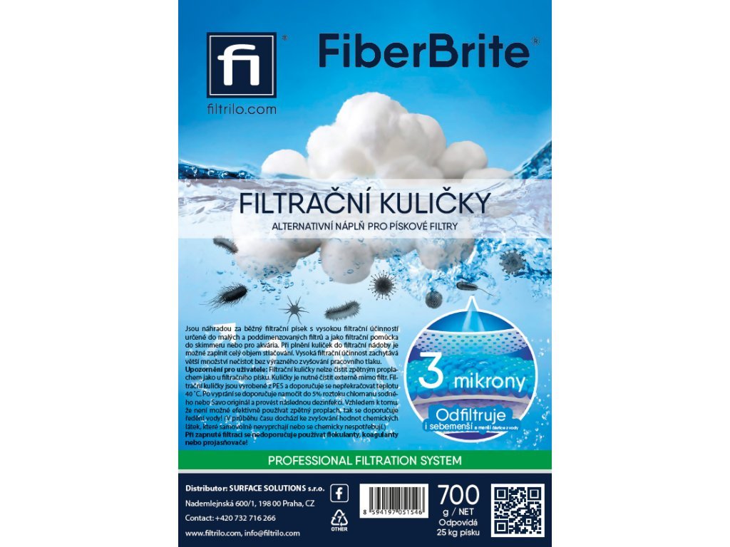 FIBER BRITE je jediné certifikované filtrační médium pro pitnou vodu a extra čistou bazénovou vodu. Filtrační kuličky FIBER BRITE jsou náhradou za běžný filtrační písek se skutečně vysokou filtrační účinností. Dokáží odfiltrovat částice až do velikosti 3 mikronů (písek pouze 20 mikronů). Při plnění kuliček do filtrační nádoby je možné zaplnit celý objem bez stlačování. Vysoká filtrační účinnost zachytává větší množství nečistot bez výrazného zvyšování pracovního tlaku. Proto se doporučuje pravidelná kontrola stavu a čištění filtračních kuliček.